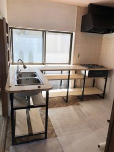 「シンプルなアイアンレッグの上に天板を載せて、扉なしの現わしのシンプルキッチンにしよう」