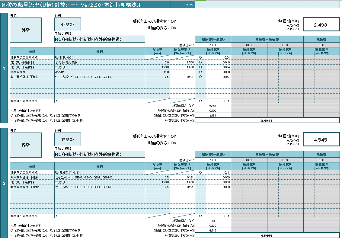 部位の熱貫流率(U値)計算シート:木造軸組構法用 Ver2.20