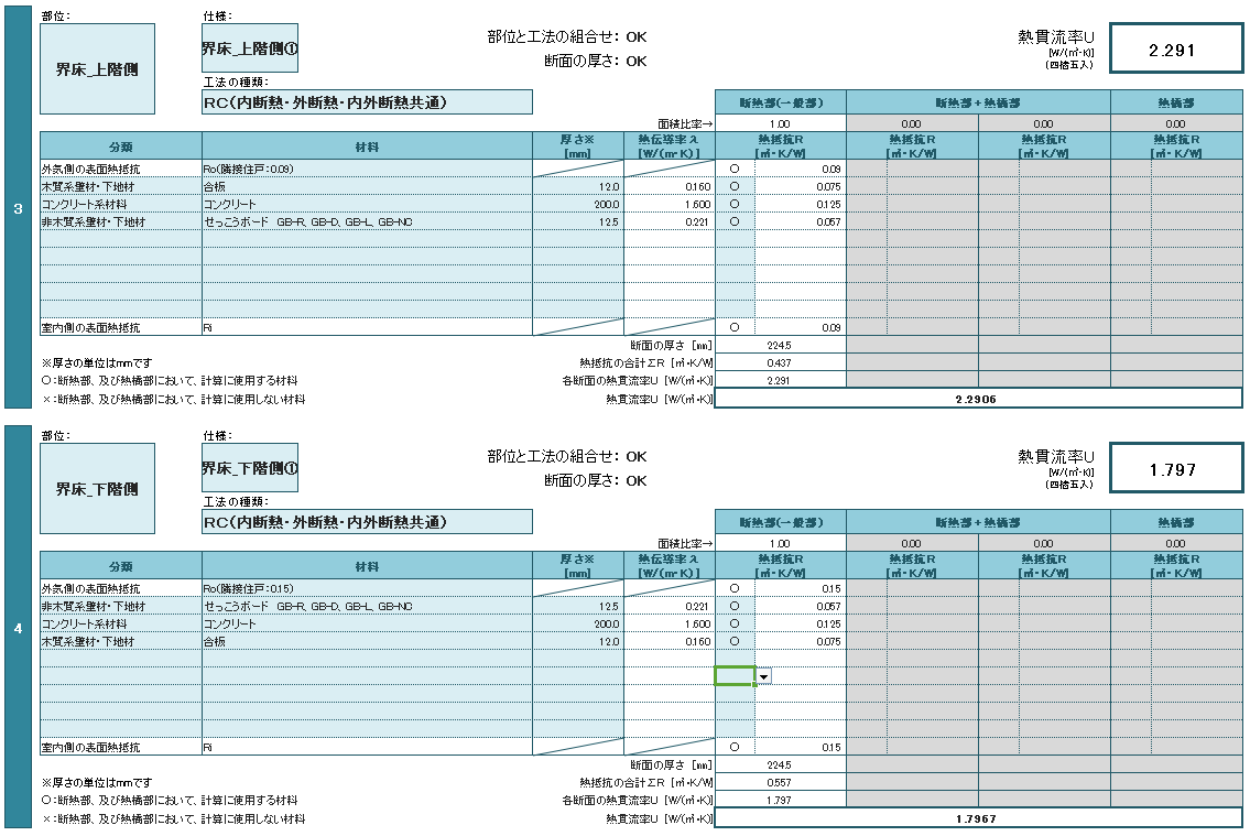 外壁・界壁・界床(上階側)・界床(下階側)の部位の熱貫流率は、