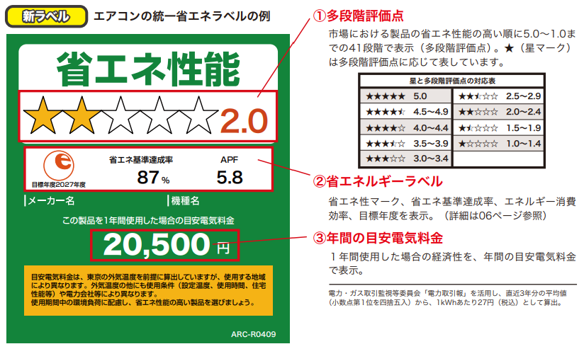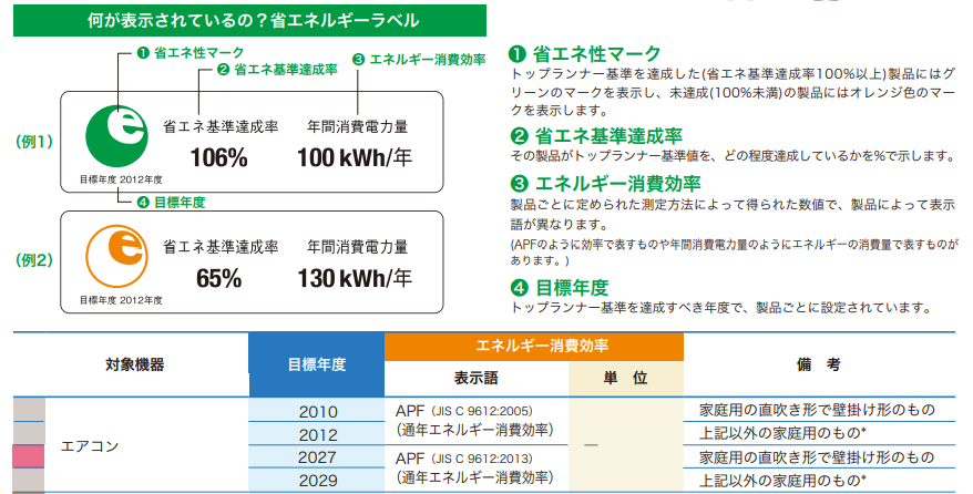 また、省エネ性を数値でみるときには「省エネ基準達成率」の〇〇%、エネルギー消費効率を表すAPFが高さを確認します。