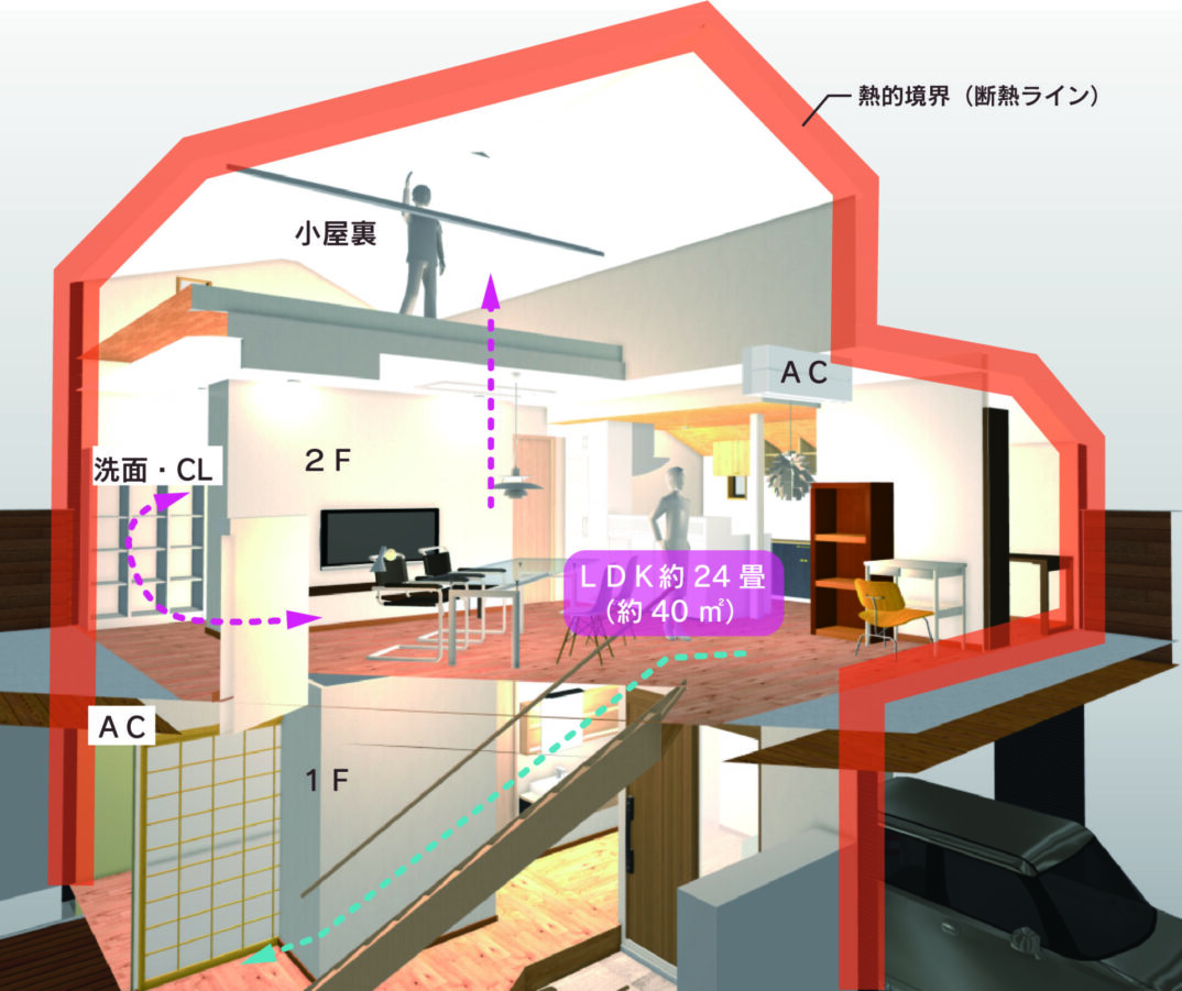 さらにLDKの上部には同じく空間が連続する小屋裏収納があり、その分の容積を考慮すると暖房容積は大きめになります。