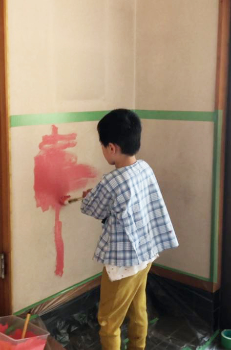 本当はパターン1と同様に、塗装の前には、古いクロスの上にシーラーを塗布しておいたほうが塗料の伸びがよくなるはずなのですが、子供が「早く塗りたい!」モード全開だったのと、私も面倒になり、シーラーの工程をパスしてしまいました💦