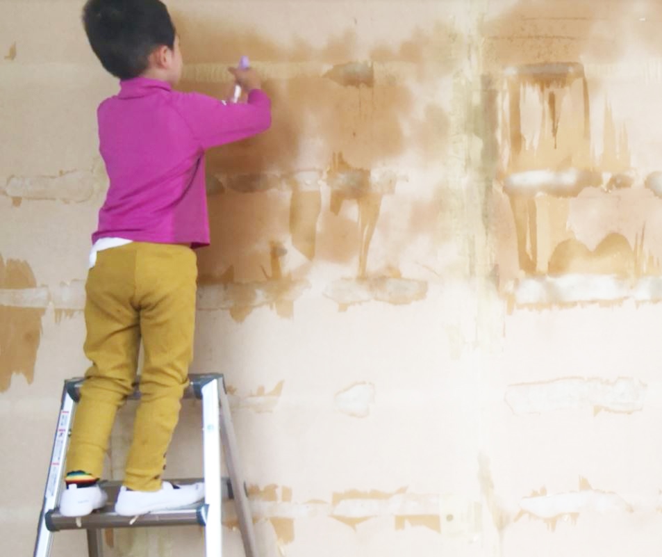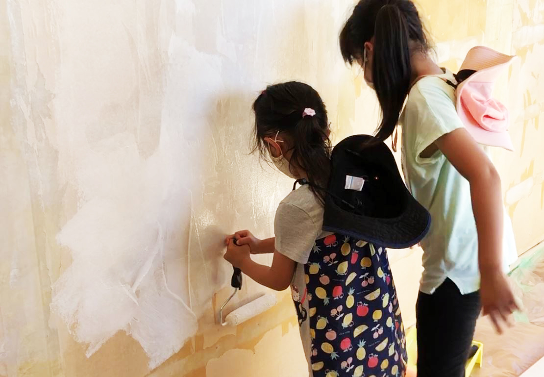 小さい子供の手で塗ると、細かく色々な方向に塗り重ねていくので、左官模様のように、かえっておもしろさが出るようです。