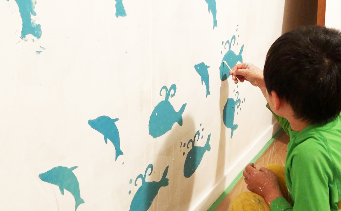 真っ白で殺風景な感じもしたので、トレーシングペーパーを型紙にして、ステンシルで海の生き物たちを壁に泳がせてみることにしました。