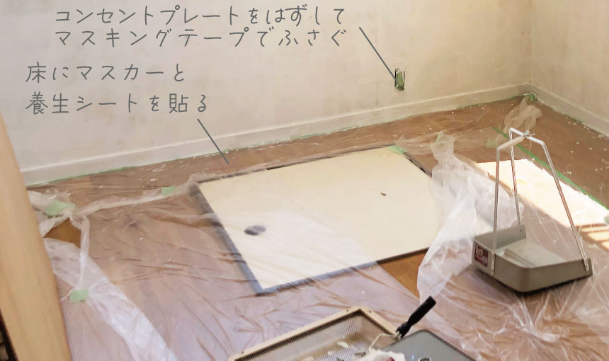 コンセントプレートははずして、マスキングテープか養生テープでふさいでおきます。